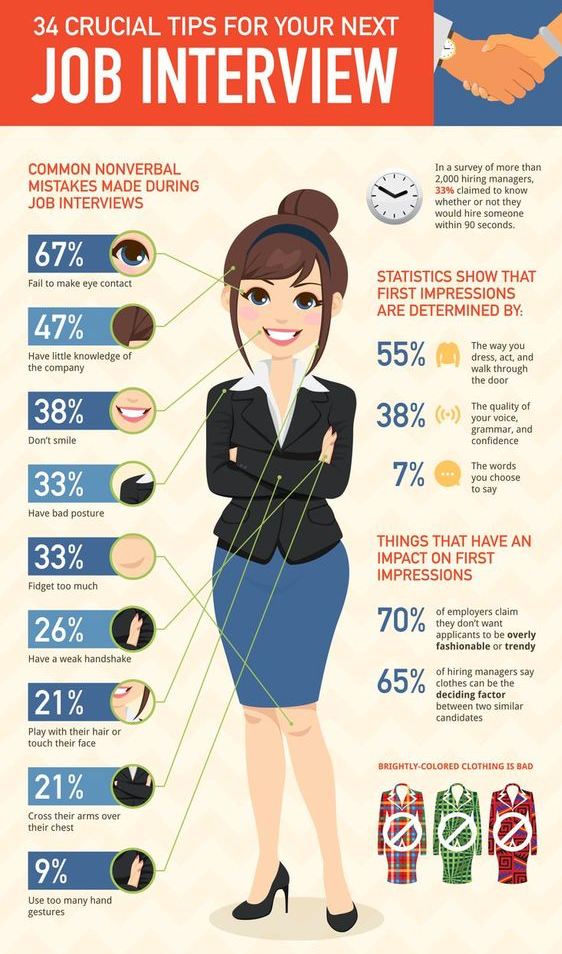 Произвести хорошее первое впечатление, значит обеспечить благосклонность работодателя в последующем интервью. Не успев заговорить, вы уже закладываете какую либо картинку о вас в его голове. Что является толчком для этого, так это ваш внешний вид. Как только вы заходите в кабинет работодателя, он уже анализирует то как вы выглядите и преподносите себя. Вы должны быть уверены, что ваш внешний вид и поведение выставляют вас в лучшем свете.