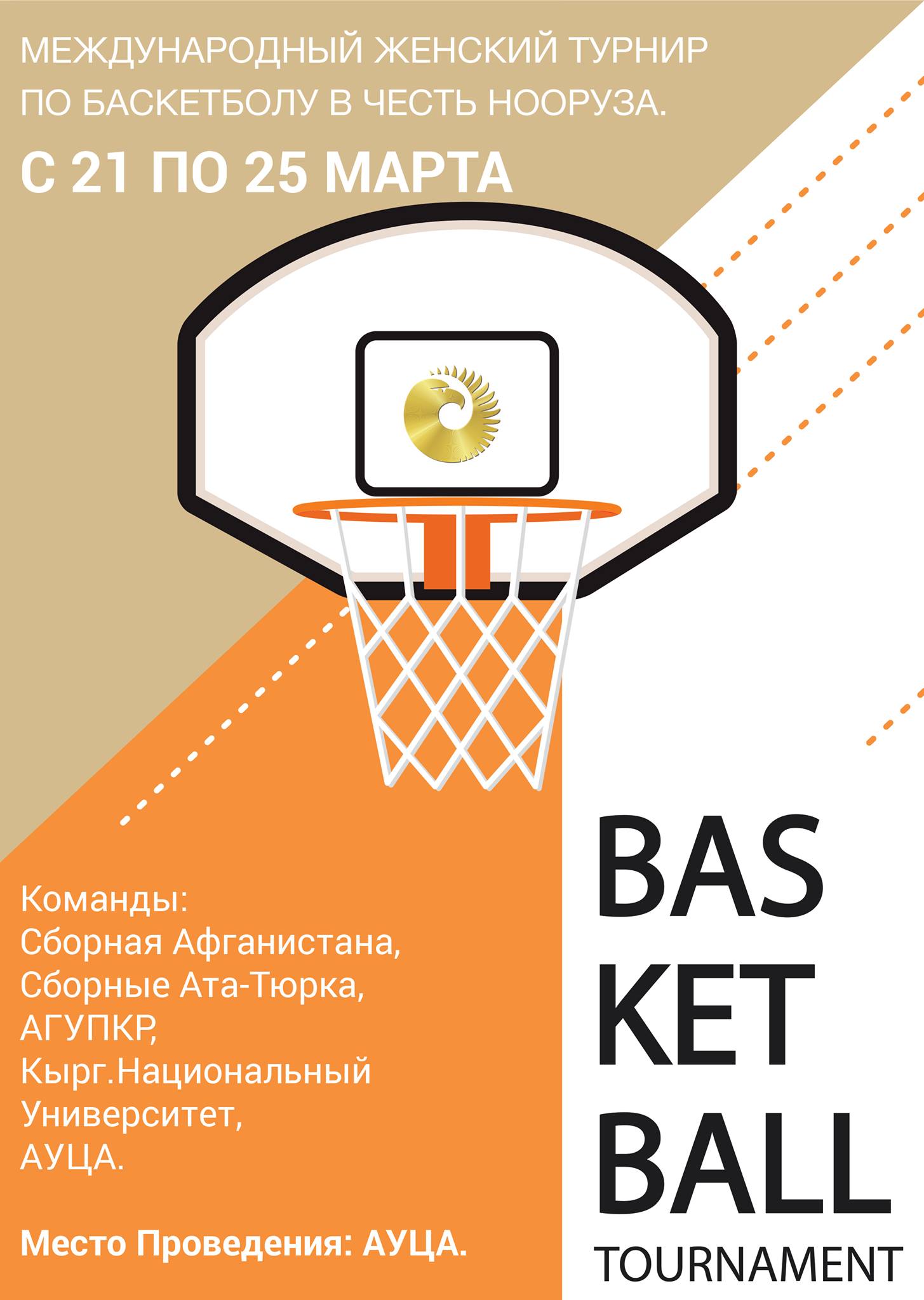 С 21 по 25 марта в АУЦА пройдет Международный женский турнир по баскетболу в честь Нооруза. В соревнованиях примут участие чемпионы первой лиги Универсиады 2016 АГУПКР, чемпионы первой лиги Универсиады 2017 Международный университет Ататюрк-Алатоо, сборные команды КНУ, АУЦА, а также сборная Афганистана. Инициатором и организатором игры выступает Американский университет в Центральной Азии.