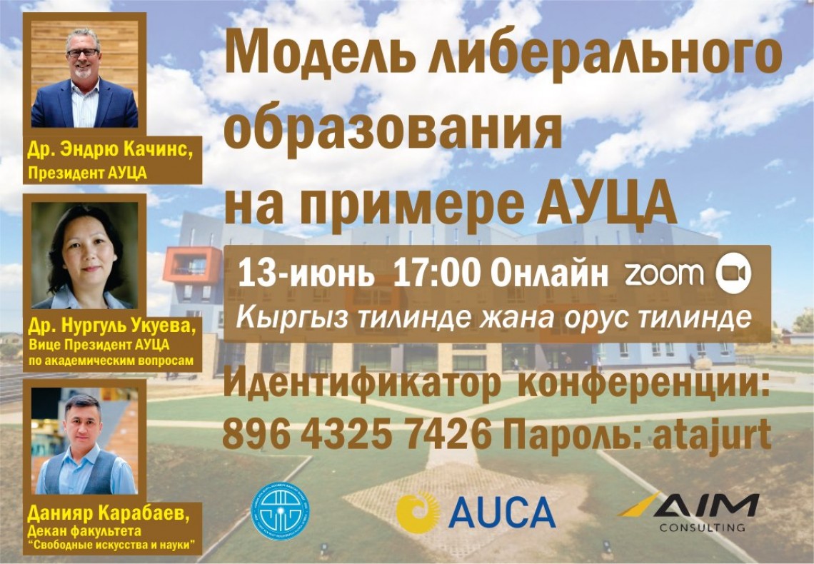 В субботу, 13 июня, в 17.00 по бишкекскому времени пройдет онлайн-конференция «Модель либерального образования на примере АУЦА». В ней примут участие президент АУЦА Эндрю Качинс и вице-президент АУЦА по академическим вопросам Нургуль Укуева и декан факультета «Свободные искусства и науки» Данияр Карабаев. Вы узнаете больше о ценности гуманитарного образования, его преимуществах, ограничениях.